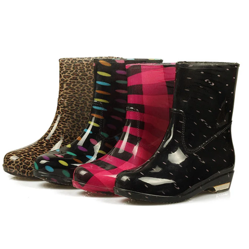 Hot selling 4 pattern plaid polka dot leopard women rainboots waterproof ankle boots PVC rain women's plaid rain boots