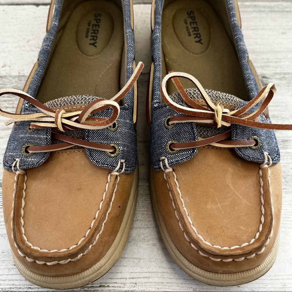 Sperry Oasis Loft Tan Leather Denim Linen Boat Shoes 7 - Gem sperry oasis loft boat shoe